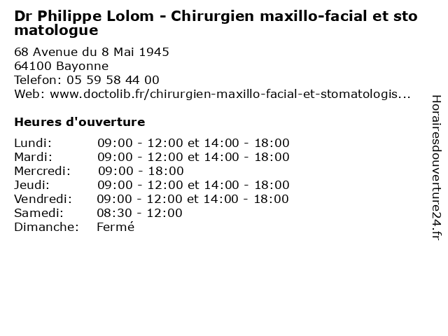 1 Dr Philippe Lolom - Chirurgien maxillo-facial et stomatologue (Distance: 14,26 km) 7 Rue Léonce Goyetche, 64500 Saint-Jean-de-Luz chirurgien, consultation, docteur, dr, et, facial, lolom, maxillo, med, médecin, médecine, philippe, stomatologue, traitement 2 Dr Alice Veyret-Duffranc - Chirurgien maxillo-facial et stomatologue (Distance: 0,00 km) 68 Avenue du 8 Mai 1945, 64100 Bayonne alice, chirurgien, consultation, docteur, dr, duffranc, et, facial, maxillo, med, médecin, médecine, secrétariat, stomatologue, traitement, veyret 3 Dr Olivier Nau - Chirurgien maxillo-facial et stomatologue (Distance: 0,00 km) 68 Avenue du 8 Mai 1945, 64100 Bayonne chirurgien, consultation, docteur, dr, et, facial, maxillo, med, médecin, médecine, nau, olivier, secrétariat, stomatologue, traitement 4 Dr Sylvie Guyot - Chirurgien maxillo-facial et stomatologue (Distance: 4,26 km) 21 rue de Estagnas, 64200 Biarritz chirurgien, consultation, docteur, dr, et, facial, guyot, maxillo, med, médecin, médecine, stomatologue, sylvie, traitement 5 Medecin Gregory Parrau (Chirurgien maxillo-facial) (Distance: 4,86 km) 49 Avenue Rene Victoria, 64200 Biarritz chirurgien, docteur, facial, gregory, maxillo, medecin, parrau, sante, services 6 Dr Guillaume Giran - Chirurgien maxillo-facial et stomatologue (Distance: 4,89 km) 2 Allée des Ormeaux, 64200 Biarritz chirurgien, docteur, dr, et, facial, generaliste, giran, guillaume, maxillo, medical, soin, stomatologue |