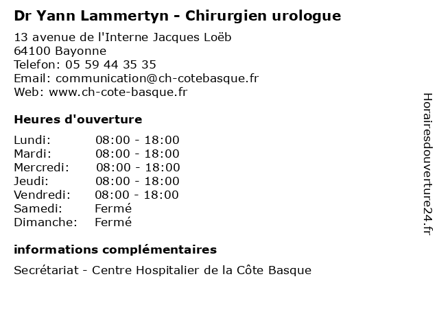 1 Dr Yann Hemery - Cardiologue (Distance: 0,00 km) 13 Avenue de l'Interne Jacques Loeb, 64100 Bayonne basque, cardio, cardiologie, cardiologue, coeur, dr, du, hemery, pays, yann 2 Dr Vincent Comat - Chirurgien urologue (Distance: 0,00 km) 13 avenue de l'Interne Jacques Loëb, 64100 Bayonne chirurgien, comat, consultation, docteur, dr, med, médecin, médecine, traitement, urologue, vincent 3 Dr Antoine Douard - Chirurgien urologue (Distance: 0,00 km) 13 avenue de l'Interne Jacques Loëb, 64100 Bayonne antoine, chirurgien, consultation, docteur, douard, dr, med, médecin, médecine, traitement, urologue 4 Dr. Laurent Mascle - Chirurgien urologue (Distance: 0,00 km) 13 avenue de l'Interne Jacques Loëb, 64100 Bayonne chirurgien, consultation, docteur, dr., laurent, mascle, med, médecin, médecine, traitement, urologue 5 Dr Pierre Mettetal - Chirurgien urologue (Distance: 2,20 km) 2 Allée Docteur Robert Lafon, 64100 Bayonne chirurgien, consultation, docteur, dr, med, mettetal, médecin, médecine, pierre, traitement, urologue 6 |