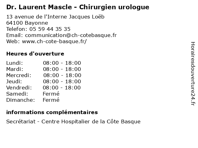 1 Dr Vincent Comat - Chirurgien urologue (Distance: 0,00 km) 13 avenue de l'Interne Jacques Loëb, 64100 Bayonne chirurgien, comat, consultation, docteur, dr, med, médecin, médecine, traitement, urologue, vincent 2 Dr Antoine Douard - Chirurgien urologue (Distance: 0,00 km) 13 avenue de l'Interne Jacques Loëb, 64100 Bayonne antoine, chirurgien, consultation, docteur, douard, dr, med, médecin, médecine, traitement, urologue 3 Dr Yann Lammertyn - Chirurgien urologue (Distance: 0,00 km) 13 avenue de l'Interne Jacques Loëb, 64100 Bayonne chirurgien, consultation, docteur, dr, lammertyn, med, médecin, médecine, traitement, urologue, yann 4 Dr Luc Soyeur - Chirurgien urologue (Distance: 0,88 km) 7 Chemin de la Marouette, 64100 Bayonne chirurgie, chirurgien, dr, general, luc, soins, soyeur, urologue 5 Laurent Coiffure (Distance: 1,72 km) 3 rue denis etcheverry, 64100 Bayonne cheveux, coiffeur, coiffure, laurent 6 Dr Pierre Mettetal - Chirurgien urologue (Distance: 2,20 km) 2 Allée Docteur Robert Lafon, 64100 Bayonne chirurgien, consultation, docteur, dr, med, mettetal, médecin, médecine, pierre, traitement, urologue |