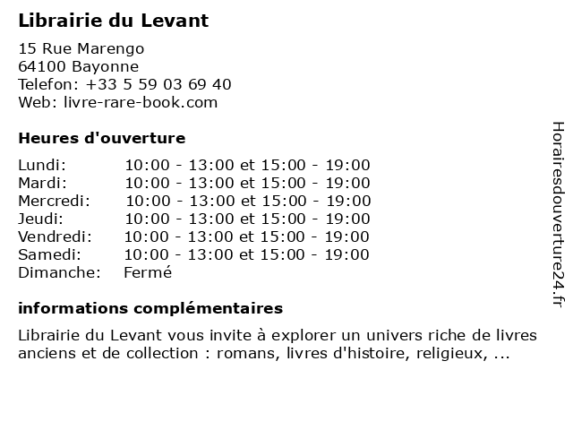 | Samedi | 10:00-13:00 et 15:00-19:00 |