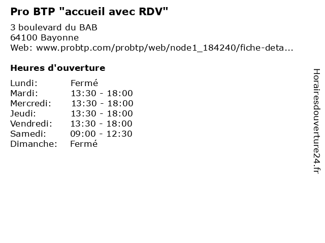 1 Accueil conseil retraite Agirc-Arrco de Bayonne - Agence PRO BTP (Distance: 0,31 km) 50 Avenue Henri Grenet Immeuble Marinadour, 64100 Bayonne accueil, agence, agirc, arrco, bayonne, btp, conseil, de, pro, retraite 3 Point Accueil Jour B.A.B. (Distance: 0,66 km) 14 Rue Sainte Ursule, 64100 Bayonne accueil, b.a.b., exclusion, jour, point, services 4 Free Dom (Accueil physique) (Distance: 0,91 km) 24 Place de la République, 64100 Bayonne accueil, aide, dom, free, gardiennage, physique, sante, services 5 Free Dom (Accueil Téléphonique) (Distance: 0,91 km) 24 Place de la République, 64100 Bayonne accueil, aide, dom, free, gardiennage, sante, services, téléphonique 6 LIP Intérim & Recrutement BTP Industrie (Distance: 1,14 km) 20 Rue Arnaud Détroyat, 64100 Bayonne btp, industrie, intérim, lip, recrutement |