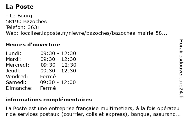 1 La Poste (Distance: 4,66 km) 6 Rue Saint Antoine, 89450 Domecy-sur-Cure agence postale, courrier postal, expédition internationale, la, poste 2 La Poste (Distance: 5,03 km) 4 Rue Grande Rue, 89450 Fontenay-prés-Vézelay express chronopost, la, poste, réexpédition internationale 3 La Poste (Distance: 7,91 km) n/a LE BOURG, 58190 BAZOCHES colis, courrier, enveloppe, envoi, la, lettres, livraison, paquets, poste, relais colis, timbres 4 La Poste (Distance: 11,64 km) 41 Place de l'Eglise, 58140 Marigny-l'Eglise colis, courrier, enveloppe, envoi, la, lettres, livraison, paquets, poste, relais colis, timbres 5 La Poste (Distance: 14,22 km) 3 Rue de la Chaume, 89200 Vault-de-Lugny express chronopost, la, poste, réexpédition internationale 6 La Poste (Distance: 14,73 km) - Le Bourg, 58190 Tannay express chronopost, la, poste, réexpédition internationale |