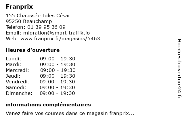 1 Franprix (Distance: 0,87 km) 18 des Chênes, 95120 ERMONT alimentation générale, entretien de la maison et de l'hygiène, franprix, franprix magasin, fruits et légumes frais 2 Franprix (Distance: 2,48 km) - rue Francois Broussais, 95150 TAVERNY alimentation générale, entretien de la maison et de l'hygiène, franprix, franprix magasin, fruits et légumes frais 3 Franprix (Distance: 4,27 km) 27-31 Boulevard Clemenceau, 95240 Cormeilles-en-Parisis alimentaire, alimentation, courses, franprix, supermarché, supérette, épicerie 4 Franprix (Distance: 7,40 km) 172 Avenue du Général de Gaulle, 78500 Sartrouville bibi, carte de fidélité, courses, franprix, magasin, produits frais, programme de fidélité, supermarché, épicerie 5 Franprix (Distance: 7,49 km) 75 bd de Bezons, 78500 SARTROUVILLE alimentation générale, entretien de la maison et de l'hygiène, franprix, franprix magasin, fruits et légumes frais 6 Franprix (Distance: 9,29 km) 76 rue Edouard Vaillant, 95870 BEZONS alimentation générale, entretien de la maison et de l'hygiène, franprix, franprix magasin, fruits et légumes frais  |