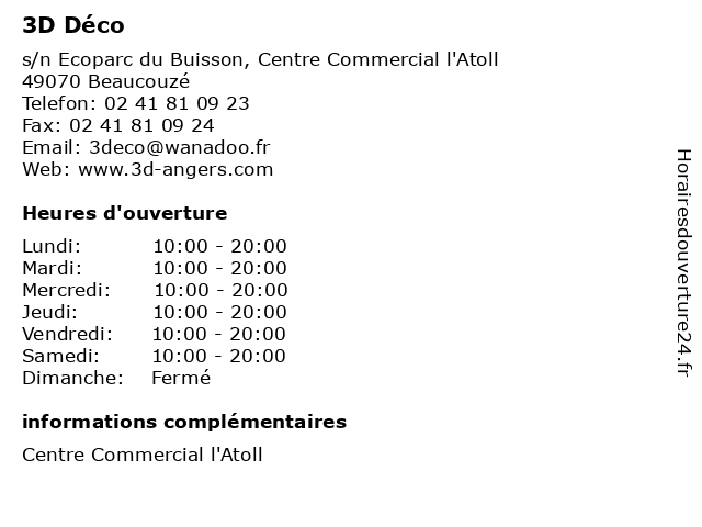 1 SARL Pavillon - Traitements 3D (Distance: 5,46 km) 19 Place Du Président Kennedy, 49100 Angers 3d, pavillon, sarl, traitements 2 SARL Pavillon - Traitements 3D (Distance: 5,46 km) 19 Place du Président Kennedy, 49100 Angers 3d, pavillon, sarl, traitements 4 L'Imprimeur 3D (Distance: 8,65 km) 110 avenue Victor Chatenay, 49003 Angers 3d, conseils, entreprise, impression, l'imprimeur, numerique, projet 5 Grassin Décors - espace déco (Distance: 8,81 km) 3 Boulevard des Bretonnières, 49124 Saint-Barthélémy d’Anjou bcl, déco, décor, décors, espace, grassin, outillage, papier, parquet, peint, peinture 6 Hygiene Environnement 3D (HE3D) (Distance: 10,02 km) 2 Rue Jules Ferry, 49800 Trélazé 3d, dératisation, désinfection, désinsectisation, environnement, he3d, hygiene, hygiène, traitement des taupes  |