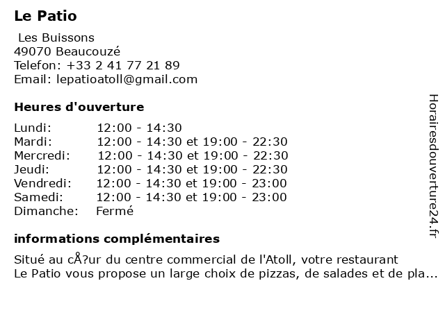 4 Le Patio (Distance: 8,41 km) 2 Rue Du Point Du Jour, 49170 Saint-Martin-du-Fouilloux gelineau, le, patio, restaurants, xavier 5 Le Patio Brasserie - Pizzeria (Distance: 0,08 km) s/n Ecoparc du Buisson, Centre Commercial l'Atoll, 49070 Beaucouzé brasserie, italien, le, patio, pizza, pizzeria, pâtes, restaurant, resto 6 Le Patio - Résidence Seniors (Distance: 38,23 km) 1 Rue Maryse Bastié, 53200 Château-Gontier-sur-Mayenne le, patio, résidence, seniors |