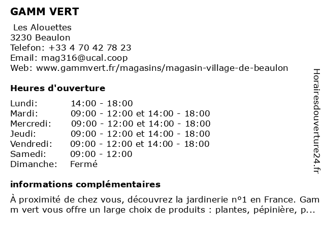 1 GAMM VERT (Distance: 7,33 km) 3 Rue d'Autun, 71140 Bourbon-Lancy aliments pour animaux, animalerie, animaux de basse-cour, arbre à chat, arbres fruitiers et arbustes de pépinière, articles de jardin, barbecues et planchas, composteur, croquettes pour chiens, désherbage, engrais bio, gamm, graine, litière pour chats, mobilier de jardin, plantes, poisson rouge, produits du terroir, rosier, récupérateur d'eau de pluie, salons de jardin et parasols, vert 2 GAMM VERT VILLAGE BEAULON (Distance: 0,05 km) Route de Bourbon Lancy, 03230 Beaulon beaulon, gamm, vert, village 3 Les Briconautes (Distance: 0,07 km) 4 Route de Bourbon Lancy, 03230 Garnat-sur-Engièvre activités de plein air, briconautes, décoration, jardin, les, menuiserie, outils, quincaillerie, sanitaire, électricité 4 Daniel Moquet signe vos jardins - Ent. Pereira (Distance: 29,32 km) 9 Rue Alfred Simon, 71130 Gueugnon création, crédit d'impôt, daniel, daniel moquet jardins, daniel moquet paysagiste, débroussaillage, désherbage, engazonnement, ent., entreprise entretien jardin, entretien, espaces verts, gazon de placage, jardinier, jardins, massif paysager, moquet, nettoyage, paysagiste, paysagiste jardin, pereira, signe, taille, taille de haies, tonte de pelouse, vos 5 GAMM VERT (Distance: 34,69 km) 1177 Route de Digoin, 71600 Vitry-en-Charollais alimentation animale, animalerie, animaux de basse-cour, arbre à chat, arbres fruitiers et arbustes de pépinière, barbecues et planchas, composteurs, croquettes pour chiens, désherbage, engrais bio, gamm, graines, litière pour chats, mobilier de jardin, outils de jardin, plantes, poissons, produits du terroir, rosiers, récupérateurs d'eau de pluie, salons de jardin et parasols, vert 6 GAMM VERT (Distance: 44,70 km) 1 Rochère, 42620 Saint-Martin-d'Estréaux alimentation animale, animalerie, animaux de basse-cour, arbre à chat, arbres fruitiers et arbustes de pépinière, barbecues et planchas, composteurs, croquettes pour chiens, désherbage, engrais bio, gamm, graines, litière pour chats, mobilier de jardin, outils de jardin, plantes, poissons, produits du terroir, rosiers, récupérateurs d'eau de pluie, salons de jardin et parasols, vert |