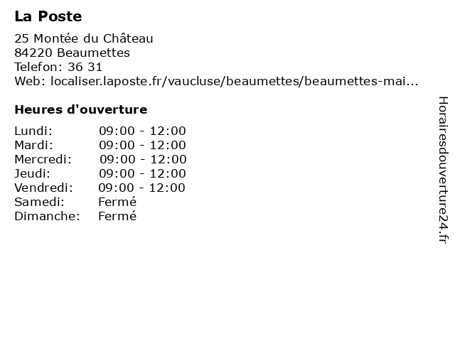 2 La Poste (Distance: 3,26 km) 24 passage Guy Guiton, 84220 Goult agence, assurance, banque, banque postale, bureau de poste, chronopost, colis, courrier, dps, expéditions internationales, la, point, postale, poste, relais, timbres, téléphonie, ups, western union 3 La Poste (Distance: 4,92 km) 80 A Route de Cavaillon, 84660 Maubec agence, colis, courriers, expédition, la, postale, poste, relais 4 La Poste (Distance: 5,24 km) 5065 Chemin des Aires, 84660 Maubec agence, assurance, banque, banque postale, bureau de poste, chronopost, colis, courrier, dps, expéditions internationales, la, point, postale, poste, relais, timbres, téléphonie, ups, western union 5 La Poste (Distance: 6,29 km) 36 Place de l'Église, 84480 Lacoste agence, colis, courriers, expédition, la, postale, poste, relais 6 La Poste (Distance: 7,42 km) - Place de l'Église, 84440 Robion agence, assurance, banque, banque postale, bureau de poste, chronopost, colis, courrier, dps, expéditions internationales, la, point, postale, poste, relais, timbres, téléphonie, ups, western union |