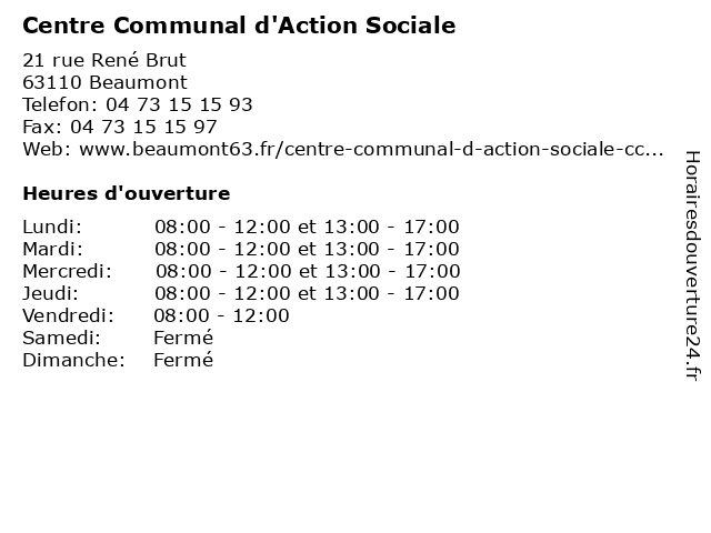1 Centre Communal d'Action Sociale (Distance: 2,53 km) 1 rue Saint-Vincent, 63013 Clermont-Ferrand aides, ccas, centre, communal, d'action, logement, personnes âgées, prévention santé, sociale 2 Centre Communal d'Action Sociale (Distance: 2,88 km) 17 avenue de Royat, 63402 Chamalières aides, ccas, centre, communal, d'action, logement, personnes âgées, prévention santé, sociale 3 Centre Communal d'Action Sociale (Distance: 8,37 km) 15 impasse des Dômes, 63800 Cournon-d'Auvergne aides, ccas, centre, communal, d'action, logement, personnes âgées, prévention santé, sociale 4 Centre Communal d'Action Sociale (Distance: 15,64 km) 15 rue du Docteur Ducher, 63200 Riom aides, ccas, centre, communal, d'action, logement, personnes âgées, prévention santé, sociale 5 Mutualité Sociale Agricole (Distance: 2,06 km) 75 Boulevard François-Mitterrand, 63972 Clermont Ferrand administration, agricole, assoc, mutualité, services, services publics, sociale 6 CCAS - Centre Communal d'Action Sociale (Distance: 2,53 km) 1 Rue Saint Vincent De Paul, 63000 Clermont-Ferrand action, ccas, centre, communal, d'action, restaurants, sociale |
