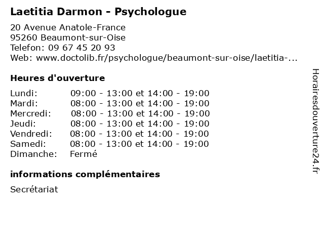 | Lundi | 09:00-13:00 et 14:00-19:00 |