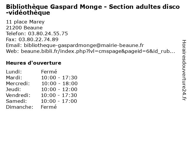 1 Bibliothèque Gaspard Monge - Section adultes disco-vidéothèque (Vacances Scolaires) (Distance: 0,00 km) 11 place Marey, 21200 Beaune adultes, bibliothèque, cd, disco, dvd, gaspard, jeux videos, livres, monge, revues, scolaires, section, vacances, vidéothèque 2 Bibliothèque Gaspard Monge - Section jeunesse (Distance: 0,00 km) 11 place Marey, 21200 Beaune bibliothèque, cd, dvd, gaspard, jeunesse, jeux videos, livres, monge, revues, section 3 Bibliothèque Gaspard Monge - Section jeunesse (Vacances Scolaires) (Distance: 0,00 km) 11 place Marey, 21200 Beaune bibliothèque, cd, dvd, gaspard, jeunesse, jeux videos, livres, monge, revues, scolaires, section, vacances 4 Boulangerie place Monge - Marie Boucherot (Distance: 0,18 km) 20 Place Monge, 21200 Beaune boucherot, boulangerie, marie, monge, place 6 Bibliothèque (Distance: 4,39 km) . Rue Vauchey Ver, 21420 Savigny-les-Beaune bibliothèque, cd audio, cd.rom, livres, revues |