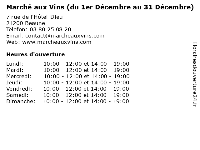 1 Marché aux Vins (du 1er Avril au 30 Novembre) (Distance: 0,00 km) 7 rue de l'Hôtel-Dieu, 21200 Beaune 1er, 30, accompagnement, alcool, anciennete, annee, au, aux, avril, blanc, cave, desserts, doux, du, fort, marché, marque, novembre, plats, vins 2 Marché aux Vins (du 2 Janvier au 31 Mars) (Distance: 0,07 km) 7 rue de l'Hôtel-Dieu, 21200 Beaune 31, accompagnement, alcool, anciennete, annee, au, aux, blanc, cave, desserts, doux, du, fort, janvier, marché, marque, mars, plats, rouge, vins 3 Marché à Beaune (Distance: 0,07 km) . Halle, 21200 Beaune beaune, frutas, hortalizas, marché, mercado, verduras 4 Le Cellier de la Cabiote (du 1er Décembre au 28 Février) (Distance: 0,20 km) 11 rue de l'Enfant, 21200 Beaune 1er, 28, accompagnement, alcool, anciennete, annee, au, blanc, cabiote, cave, cellier, de, desserts, doux, du, décembre, fort, février, la, le 5 Le Cellier de la Cabiote (du 1er Mars au 30 Novembre) (Distance: 0,22 km) 11 rue de l'Enfant, 21200 Beaune 1er, 30, accompagnement, alcool, anciennete, annee, au, blanc, cabiote, cave, cellier, de, desserts, doux, du, fort, la, le, mars, novembre 6 Beaune Côté Plage - Haute saison (du 31 juillet au 03 septembre) (Distance: 0,49 km) - rue André Gagey, 21200 Beaune 03, 31, aqua, aquatique, au, beaune, côté, du, haute, juillet, piscine, plage, saison, septembre |