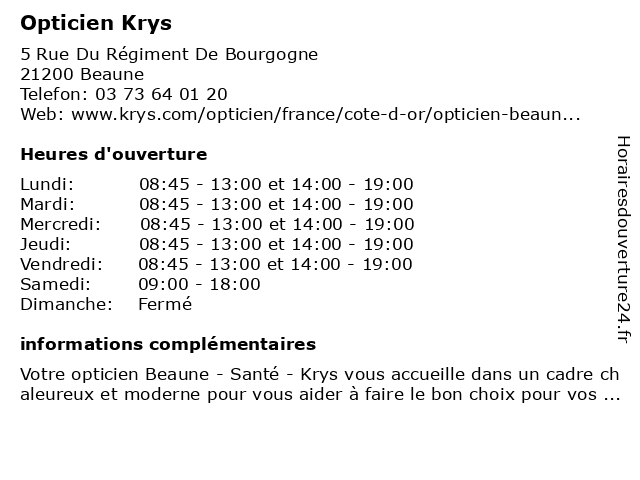 1 Opticien Krys (Distance: 16,34 km) 2 Rue Charles André Rémi Arnoult, 21700 Nuits-saint-georges krys, magasin de lentilles correctrices, magasin de lunettes de soleil, magasin d’accessoires de mode, opticien, optométrie 2 Audioprothésiste Krys Audition (Distance: 0,00 km) 5 Rue Du Régiment De Bourgogne, 21200 Beaune audiologie, audioprothésiste, audition, krys 3 Opticien Beaune | Alain Afflelou (Distance: 0,93 km) 22 Rue D'alsace, 21200 Beaune afflelou, alain, beaune, cabinet d'ophtalmologie, magasin de lunettes de soleil, ophtalmologie, opticien, optométrie 4 Opticien BEAUNE Optical Center (Distance: 0,99 km) 16 Boulevard Jules Ferry, 21200 Beaune beaune, center, optical, opticien 5 Atol Mon Opticien (Distance: 1,02 km) 9 Place Carnot, 21200 Beaune atol, atol les opticiens, atol mon opticien, lentilles, lunettes de soleil, lunettes de vue, mon, opticien, opticien beaune 6 Opticien Beaune - Optic 2000 - Rue Gustave Effeil (Distance: 3,15 km) 13 Rue Gustave Eiffel, 21200 Beaune 2000, beaune, effeil, gustave, lentilles de contact, lunettes de soleil, lunettes de vue, optic, optic2000, opticien, opticien optic2000, ray-ban, rayban, rue |
