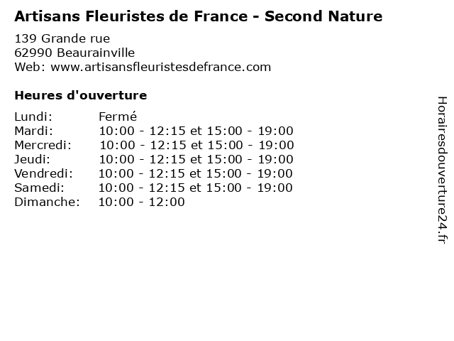 1 Artisans Fleuristes de France - Second Nature (Distance: 16,79 km) 27 Place du General De Gaulle, 62170 Montreuil artisans, bouquets, de, fleuristes, flowers, france, nature, second, the funeral, wedding collection 2 Nature Et Jardin (Distance: 5,07 km) 12 bis Rue du Onze Novembre, 62140 Huby-Saint-Leu et, jardin, nature 3 La Cité des Artisans (Distance: 9,94 km) 2 Rue de la place, 62870 Buire-le-Sec art, artisanale, artisans, boutique, cité, des, la, la cité des artisans 5 Nature Et Construction (Distance: 18,58 km) 18 Rue de la Chapelle, 62560 Verchocq construction, et, nature 6 SFR (Distance: 26,19 km) - Vigogne, 62600 Berck abonnements de téléphonie mobile ou fixe fixe ou carte prépayée, accès internet haut débit ou la fibre optique ainsi que des abonnements à des bouquets de chaînes de télévision ., sfr, téléphones mobiles |