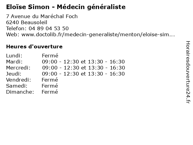 1 Eloïse Simon - Médecin généraliste (Distance: 6,65 km) 4 Rue Victor Hugo, 06500 Menton docteur, eloïse, generaliste, généraliste, medecin, médecin, simon, soins 2 Pizza Simon's (Distance: 6,66 km) 9 Avenue de Sospel, 06500 Menton café, italien, pizza, pizzas, pizzeria, restaurant, restauration, simon's 3 Medecin Jean Marc Simon (hépatologue) (Distance: 12,39 km) 5 Barla, 06300 Nice docteur, hépatologue, jean, marc, medecin, sante, services, simon 4 Restaurant Simon (Distance: 12,97 km) Quart Gairaut Sup Ld Aire St Michel, 06950 Falicon patrick, restaurant, restaurants, simon, societe 5 Maître Simon-Pierre Daboussy - Avocat (Distance: 13,25 km) 54 rue Gioffredo, 06000 Nice avocat, avocats, civils, daboussy, droits, juridiques, maître, pierre, simon 6 Pau Simon Theo Maxime (Distance: 13,37 km) 31 b Avenue Marechal Foch, 06000 Nice maxime, pau, restaurants, simon, theo |