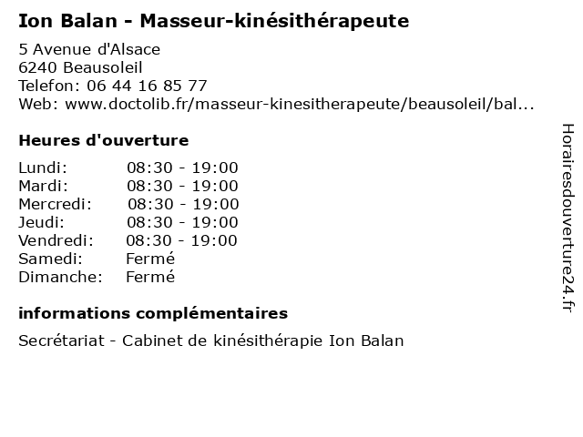 1 Saint Pauloise Hoteliere Et De Restaurat Ion Artis (Distance: 24,29 km) 86 Rue Grande, 06570 St Paul De Vence artis, hoteliere, ion, pauloise, restaurants, restaurat, saint 2 Yannick Guillaumet - Masseur-kinésithérapeute (Distance: 0,09 km) 11 Avenue d'Alsace, 06240 Beausoleil guillaumet, kiné, kinésithérapeute, masseur, rééducation, soin, yannick 3 Vincent Mosser - Masseur-kinésithérapeute (Distance: 0,56 km) 8 Avenue Camille Blanc, 06240 Beausoleil kiné, kinésithérapeute, masseur, mosser, rééducation, soin, vincent 4 Caroline Contat - Masseur-kinésithérapeute (Distance: 0,63 km) 16 Boulevard de la République, 06240 Beausoleil caroline, contat, kiné, kinésithérapeute, masseur, rééducation, soin 5 Fabrizio Mancini - Masseur-kinésithérapeute (Distance: 0,65 km) 9 Boulevard de la République, 06240 Beausoleil fabrizio, kiné, kinésithérapeute, mancini, masseur, rééducation, soin 6 Alexia Becchi - Masseur-kinésithérapeute (Distance: 1,15 km) 20 Avenue de Fontvieille, 98000 Monaco alexia, becchi, kiné, kinésithérapeute, masseur, rééducation, soin |