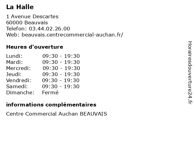 | 1 La Halle (Distance: 0,00 km) n/a Avenue Descartes, 60000 Beauvais bags, child, clothing, halle, la, lingerie, man, shoes, woman 2 La Halle (Distance: 0,24 km) 2 Avenue Descartes, 60000 Beauvais accessoires, bons plans, chaussures, chemise, halle, la, la halle, maroquinerie, mode bébé, mode enfant, mode femme, mode homme, pantalon, pas cher, petits prix, promotions, prêt à porter, pull, robe, t shirt, veste, vêtements 3 La Halle (Distance: 5,29 km) n/a Avenue des Censives, 60000 Tillé bags, child, clothing, halle, la, lingerie, man, shoes, woman 4 La Halle Outlet (Distance: 17,77 km) . Rue Jean Jaurès, 60250 Angy chaussures, enfants, halle, la, mode femme, mode homme, outlet 5 La Halle (Distance: 20,41 km) . Rue Marcel Coquet, 60110 Meru beaute, cafe, chaussures, enfants, halle, la, lingerie, mode femmes, mode hommes, restaurant, royaume, sport 6 La Halle O Chaussures (Distance: 20,41 km) . Rue Marcel Coquet, 60110 Meru beaute, cafe, chaussures, enfants, halle, la, lingerie, mode femmes, mode hommes, restaurant, royaume, sport |