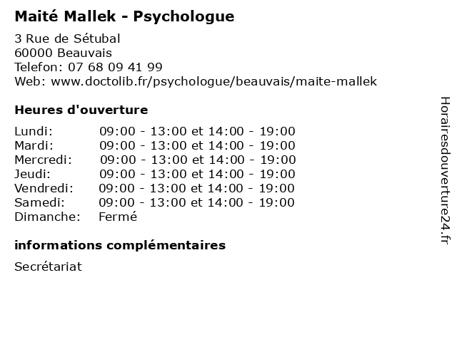 | Lundi | 09:00-13:00 et 14:00-19:00 |