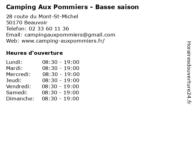 1 Camping Aux Pommiers - Haute saison (Distance: 0,00 km) 28 route du Mont-Saint-Michel, 50170 Beauvoir accueil, aux, camping, en, haute, loisirs, pommiers, saison, tourisme, vacances 2 Camping Saint-Michel - Basse saison (Distance: 7,83 km) 35 route du Mont-Saint-Michel, 50220 Courtils accueil, basse, camping, loisirs, michel, saint, saison, st., tourisme, vacances 3 Aux portes de la baie - gîtes avec piscine et sauna - Mont-Saint-Michel (Distance: 8,64 km) 6 Ballant, 50170 Vessey agence de location de maisons de vacances, aux, avec, baie, bed & breakfast, de, et, gîtes, hôtels, la, lodge, michel, mont, piscine, portes, saint, sauna 4 Bar Restaurant Aux Saveurs De La Mer (Distance: 14,67 km) 18 Place De l Eglise, 35120 Cherrueix aux, bar, mer, restaurant, restaurants, saveurs 5 Aux Gourmandises de Laurette (Distance: 14,81 km) 18 Rue du General Patton, 50300 Avranches aux, de, gourmandises, laurette 6 La Foire Aux Tissus (Distance: 14,90 km) 90 route de Granville, 50300 Marcey-les-Grèves ameublement, aux, confection, foire, la, laines, mercerie, tissus |