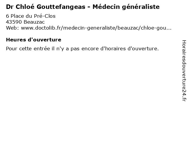 1 Dr Chloé Gouttefangeas - Médecin généraliste (Distance: 6,93 km) 6 place du Pré-Clos, 43590 Beauzac chloé, docteur, dr, generaliste, gouttefangeas, généraliste, medecin, médecin, soins 3 Chloé Chancenotte - Sage-femme (Distance: 26,03 km) 36 Rue du Onze Novembre, 42100 Saint-Étienne chancenotte, chloé, femme, medical, sage, sagefemme 4 Maître Alice Gouttefangeas - Avocate (Distance: 26,92 km) 2 rue de la République, 42000 Saint-Etienne alice, avocat, avocate, droit, gouttefangeas, juridictionnelle, maître, négociation 5 Dr Jane-Chloé Trone - Cancérologue radiothérapeute (Distance: 29,55 km) 108 bis Avenue Albert Raimond, 42270 Saint-Priest-en-Jarez cancérologue, chloe, chloé, consultation, docteur, dr, jane, med, médecin, radiothérapeute, traitement, trone 6 Dr Chloé Demougeot - Médecin généraliste (Distance: 29,68 km) 5 Rue Voltaire, 42270 Saint Priest en Jarez chloé, consultation, demougeot, docteur, dr, dr.chloe, générale, généraliste, médecin, médecine, rendez, santé, sur, vous |