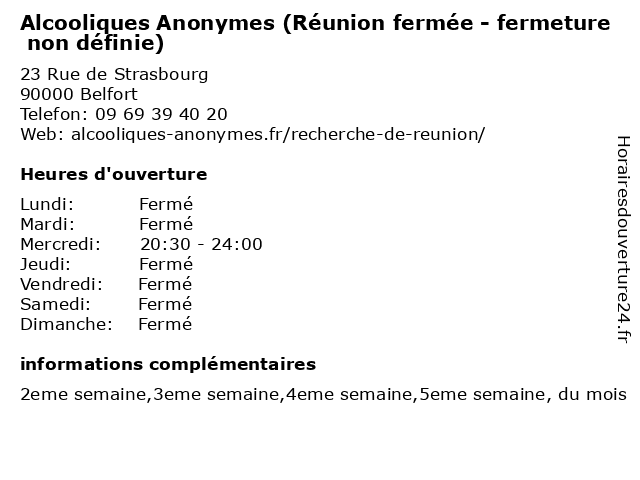 Termes de recherche pour Alcooliques Anonymes (Réunion fermée - fermeture non définie):reunion, non, fermeture, alcooliques, anonymes, définie, fermée |