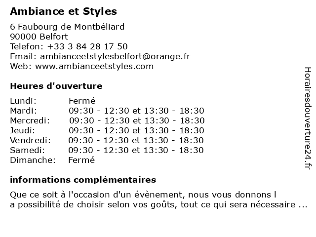 | Samedi | 09:30-12:30 et 13:30-18:30 |