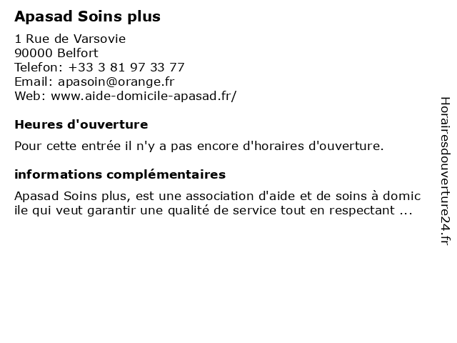 2 Apasad Soins Plus (Distance: 11,79 km) 16 Rue de Sochaux, 25200 Grand-Charmont accompagnement, aides, apasad, plus, services, soins 5 Gym Plus - Horaires du bureau (Distance: 2,33 km) 121 Avenue Jean Jaurès, 90000 Belfort bureau, centre, cours, du, gym, horaires, l'exercice, la santé, le sport, les muscles, plus 6 |