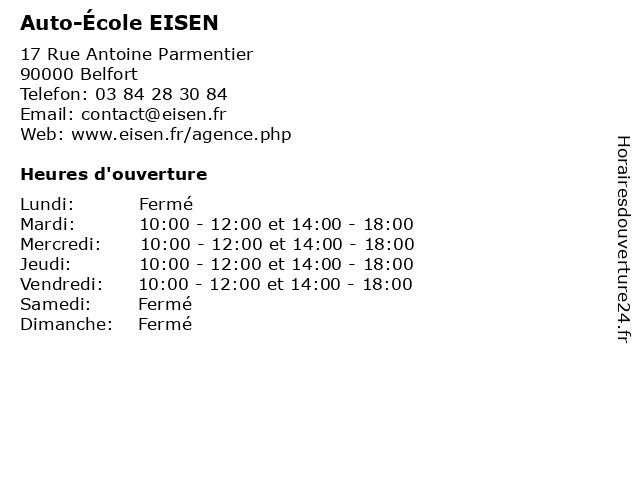 1 Auto-École EISEN (Distance: 11,08 km) 14 rue du 11 Novembre, 70400 Héricourt auto, auto école, code, cours, eisen, formation, permis, école 2 Auto-École EISEN (Distance: 16,91 km) - Rue du Champ de Foire, 25200 Montbéliard auto, auto école, code, cours, eisen, formation, permis, école 3 Ecole de conduite EISEN - Belfort Courbet (Distance: 0,24 km) 1 Rue Général Gambiez, 90000 Belfort belfort, conduite, courbet, de, ecole, eisen 4 Ecole de conduite EISEN - Belfort Gare (Distance: 2,25 km) 4 Rue Aristide Briand, 90000 Belfort belfort, conduite, de, ecole, eisen, gare 5 Ecole de conduite EISEN - Chèvremont (Distance: 4,74 km) Chemin du Circuit Eisen, 90340 Chèvremont chèvremont, conduite, de, ecole, eisen 6 Ecole de Conduite Eisen Héricourt (Distance: 11,08 km) 14 Rue du 11 Novembre, 70400 Héricourt conduite, de, ecole, eisen, héricourt |