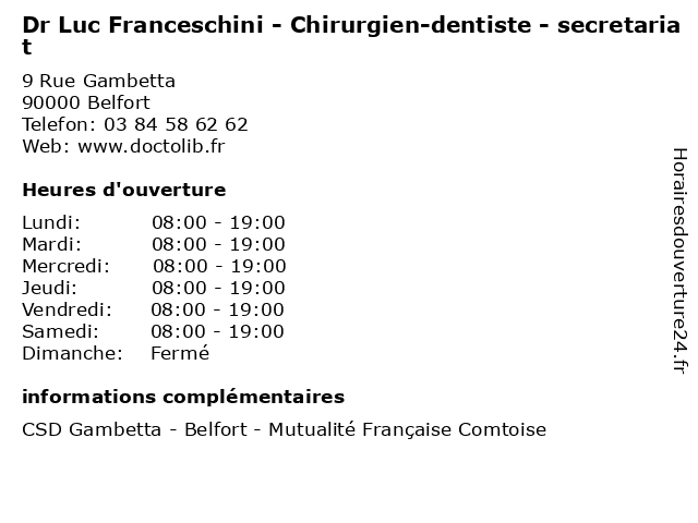 1 Dr Patrick Tritsch - Chirurgien-dentiste - secretariat (Distance: 0,00 km) 9 Rue Gambetta,, 90000 Belfort chirurgien, dentiste, dr, médecin, médecine, médical, patrick, pharmaceutique, secretariat, traitement, tritsch 2 Dr Maîté Preiss - Chirurgien-dentiste - secretariat (Distance: 0,00 km) 9 Rue Gambetta, 90000 Belfort chirurgien, dentiste, dr, maîté, médecin, médecine, médical, pharmaceutique, preiss, secretariat, traitement 3 Valérie Besch - Infirmière -secretariat (Distance: 1,83 km) 21 Rue de la 5ème Db,, 90000 Belfort besch, infirmière, médecin, médecine, médical, pharmaceutique, secretariat, traitement, valérie 4 Dr Véronique Waked - Chirurgien-dentiste - secretariat (Distance: 5,96 km) 27 BIS Avenue du Général de Gaulle, 90380 Roppe chirurgien, dentiste, dr, médecin, médecine, médical, pharmaceutique, secretariat, traitement, véronique, waked 5 Dr Luc Sengler - Médecin généraliste (Distance: 6,41 km) 100 Route de Moval, 90400 Trévenans consultation, docteur, dr, généraliste, luc, med, médecin, sengler, traitement 6 Charberet Matthias Luc (Distance: 9,94 km) 17 Rue Du Moulin, 90110 Saint Germain Le Chatelet charberet, luc, matthias, restaurants |