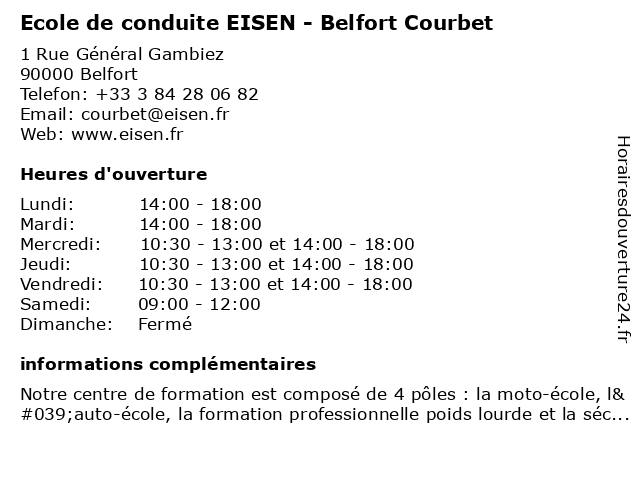 1 Auto-École EISEN (Distance: 0,24 km) 17 Rue Antoine Parmentier, 90000 Belfort auto, auto école, code, cours, eisen, formation, permis, école 2 Ecole de conduite EISEN - Belfort Gare (Distance: 2,32 km) 4 Rue Aristide Briand, 90000 Belfort belfort, conduite, de, ecole, eisen, gare 3 Ecole de conduite EISEN - Chèvremont (Distance: 4,59 km) Chemin du Circuit Eisen, 90340 Chèvremont chèvremont, conduite, de, ecole, eisen 4 Auto-École EISEN (Distance: 11,29 km) 14 rue du 11 Novembre, 70400 Héricourt auto, auto école, code, cours, eisen, formation, permis, école 5 Ecole de Conduite Eisen Héricourt (Distance: 11,29 km) 14 Rue du 11 Novembre, 70400 Héricourt conduite, de, ecole, eisen, héricourt 6 Ecole de conduite EISEN - Montbéliard (Distance: 17,00 km) Rue du Champ de Foire, 25200 Montbéliard conduite, de, ecole, eisen, montbéliard |