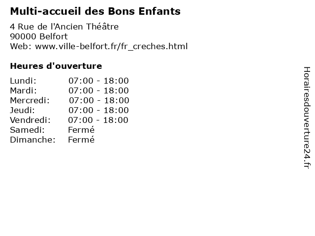 1 Multi-accueil Fréry (Distance: 0,27 km) 10 Rue du Docteur Fréry, 90000 Belfort accueil, crèche, enfant, fréry, garde d'enfants, jardin d'enfants, multi, pédagogie, soins toute la journée 2 Kangourou Kids | Agence de garde d'enfants (Distance: 0,28 km) 18 Grande Rue, 90000 Belfort agence, babysitter, babysitting, d'enfants, de, garde, garde enfant, garde enfant a domicile, kangourou, kids, nounou, sortie ecole 3 Maison Départementale des Personnes Handicapées (Accueil téléphonique) (Distance: 0,32 km) . Rue de l'As-de-Carreau, 90008 Belfort accueil, administration, assoc, des, départementale, handicapées, maison, personnes, services, services publics, téléphonique 4 Multi-accueil des Glacis du Château (Distance: 0,67 km) 2 Rue André Parant, 90000 Belfort accueil, château, crèche, des, du, enfant, garde d'enfants, glacis, jardin d'enfants, multi, pédagogie, soins toute la journée 5 APEF Belfort - Aide à domicile, Ménage, Jardinage et Garde d'enfants (Distance: 0,79 km) 20 Avenue Jean Jaurès, 90000 Belfort aide, apef, belfort, d'enfants, domicile, et, garde, jardinage, ménage 6 Espace Multi Services Le Fontenoy (Distance: 1,18 km) 15 Rue Marc Sangnier, 90020 Belfort cigarette, espace, fdj, fontenoy, journaux, le, multi, presse, services, tabac, épicerie |