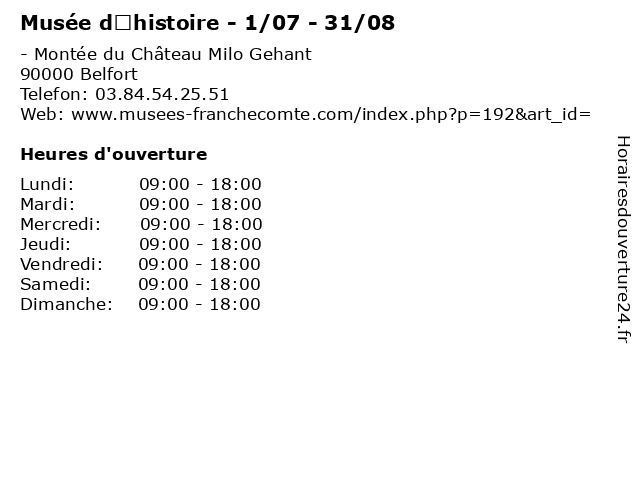 1 Musée d’histoire - 1/10 - 31/03 (Distance: 0,00 km) - Montée du Château Milo Gehant, 90000 Belfort 1/10, 31/03, ancien, art, d’histoire, exposition, histoire, livre, monument, musée, savoir 2 Musée d’histoire - 1/04 - 31/06 (Distance: 0,00 km) - Montée du Château Milo Gehant, 90000 Belfort 1/04, 31/06, ancien, art, d’histoire, exposition, histoire, livre, monument, musée, savoir 3 Musée des Beaux-Arts - 1/07 - 31/08 (Distance: 0,38 km) - Rue Georges Pompidou, 90000 Belfort 1/07, 31/08, ancien, art, arts, beaux, des, exposition, histoire, livre, monument, musée, savoir 4 Musée des Beaux-Arts - 1/04 - 31/06 (Distance: 0,38 km) - Rue Georges Pompidou, 90000 Belfort 1/04, 31/06, ancien, art, arts, beaux, des, exposition, histoire, livre, monument, musée, savoir 5 Musée des Beaux-Arts - 1/10 - 31/03 (Distance: 0,38 km) - Rue Georges Pompidou, 90000 Belfort 1/10, 31/03, ancien, art, arts, beaux, des, exposition, histoire, livre, monument, musée, savoir 6 Musée d'Art moderne de Belfort - 1/10 - 31/03 (Distance: 0,94 km) 8 Rue de Mulhouse, 90000 Belfort 1/10, 31/03, ancien, art, belfort, d'art, de, exposition, histoire, livre, moderne, monument, musée, savoir |