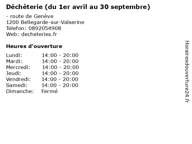 1 Déchèterie (du 1er octobre au 31mars) (Distance: 0,00 km) - route de Genève, 01200 Bellegarde-sur-Valserine 1er, 31mars, au, du, déchèterie, gravats, huiles usées, la réception des déchets et écocentres, les appareils électroménagers, les déchets verts, octobre, papier et carton en quantité 2 Office De Tourisme (Jusqu´au 30 avril 2015) (Distance: 0,99 km) 13 Rue De La Republique, 01200 Bellegarde-sur-Valserine 30, 2015, avril, de, jusqu´au, office, services publics, séjours vacances, tourisme 3 Office De Tourisme (Du 2 mai au 30 juin 2015) (Distance: 0,99 km) 13 Rue De La Republique, 01200 Bellegarde-sur-Valserine 30, 2015, au, de, du, juin, mai, office, services publics, séjours vacances, tourisme 4 Déchèterie (Distance: 2,04 km) - Rippes, 74910 Saint-Germain-sur-Rhône déchèterie, gravats, huiles usées, la réception des déchets et écocentres, les appareils électroménagers, les déchets verts, papier et carton en quantité 5 Déchèterie (Distance: 6,55 km) - Sur Fleurin, 01200 Injoux-Génissiat déchèterie, gravats, huiles usées, la réception des déchets et écocentres, les appareils électroménagers, les déchets verts, papier et carton en quantité 6 Déchèterie (du 01/03 au 31/10 ) (Distance: 11,92 km) - Genevois, 74520 Vulbens 01/03, 31/10, au, du, déchèterie, gravats, huiles usées, la réception des déchets et écocentres, les appareils électroménagers, les déchets verts, papier et carton en quantité |