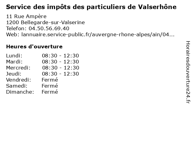 1 Centre Des Impôts - Bellegarde Sur Valserine Trésor Public (Distance: 0,01 km) 11 Rue Ampère, 01200 Bellegarde-sur-Valserine bellegarde, centre, des, impôts, public, publics, services, sur, trésor, valserine 2 Centre Des Impôts - Nantua Trésor Public (Distance: 17,64 km) 8 Rue Des Monts D'Ain, 01130 Nantua centre, des, impôts, nantua, public, publics, services, trésor 3 Centre Des Impôts - Nantua Impôts (Distance: 17,64 km) 8 Rue Des Monts D'Ain, 01130 Nantua centre, des, impôts, nantua, publics, services 4 Centre des Impôts Fonciers (Distance: 17,65 km) 8 Rue des Monts-d'Ain, 01130 Nantua administration, assoc, centre, de, des, foncier, fonciers, impôts, nantua, services, services publics 5 Centre Des Impôts - Oyonnax Impôts (Distance: 21,36 km) 2 Place Du 11 Novembre 1943, 01100 Oyonnax centre, des, impôts, oyonnax, publics, services 6 Centre Des Impôts - Oyonnax Trésorerie (Distance: 21,36 km) 2 Place Du 11 Novembre 1943, 01100 Oyonnax centre, des, impôts, oyonnax, publics, services, trésorerie |