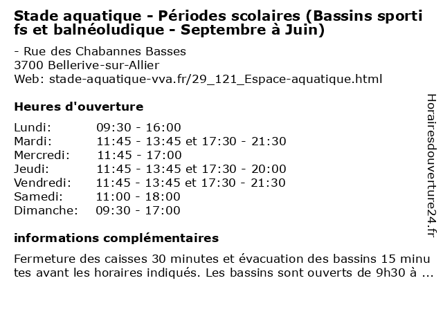 1 Stade aquatique - Périodes scolaires (Pataugeoire et toboggan - Septembre à Juin) (Distance: 0,00 km) - Rue des Chabannes Basses, 03700 Bellerive-sur-Allier aquatique, et, juin, natation sportive, pataugeoire, piscine, périodes, scolaires, septembre, sportif, stade, toboggan 2 Stade aquatique - Petites vacances (Tous bassins confondus - Septembre à Juin) (Distance: 0,00 km) - Rue des Chabannes Basses, 03700 Bellerive-sur-Allier aquatique, bassins, confondus, juin, natation sportive, petites, piscine, septembre, sportif, stade, tous, vacances 3 Piscine d'El Hogar à Anglet - Vacances scolaires (hors vacances d'été) (Distance: 0,49 km) 2 rue des Chabannes Basses, 03700 Bellerive-sur-Allier anglet, d'el, d'un sauna, d'un solarium, d'été, hogar, hors, piscine, scolaires, spa, vacances 4 Piscine d'El Hogar à Anglet - Bassin sportif Bassin balnéo-ludique (Vacances scolaires) (Distance: 0,49 km) 2 rue des Chabannes Basses, 03700 Bellerive-sur-Allier anglet, balnéo, bassin, d'el, d'un sauna, d'un solarium, hogar, ludique, piscine, scolaires, spa, sportif, vacances 5 Centre social René-Barjavel - vacances scolaires (Distance: 1,81 km) - Boulevard Franchet d’Espèrey, 03200 Vichy adolescents, adultes, animations, barjavel, centre, familles, loisirs, ren%e9, rené, scolaires, social, vacances 6 Kizou Aventures - Périodes Scolaires (Distance: 3,60 km) - Avenue de la Croix Saint-Martin, 03200 Vichy aventures, enfants, jeux, kizou, parc de jeux couverts, périodes, scolaires, sorties, toboggan |