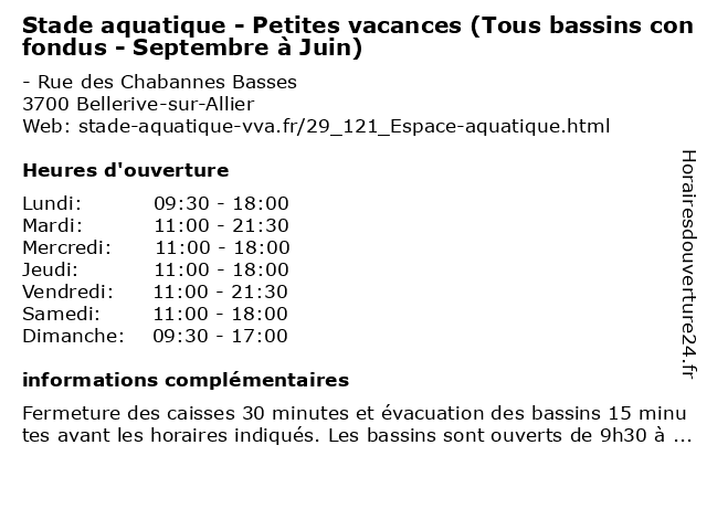 1 Stade aquatique - Périodes scolaires (Pataugeoire et toboggan - Septembre à Juin) (Distance: 0,00 km) - Rue des Chabannes Basses, 03700 Bellerive-sur-Allier aquatique, et, juin, natation sportive, pataugeoire, piscine, périodes, scolaires, septembre, sportif, stade, toboggan 2 Stade aquatique - Périodes scolaires (Bassins sportifs et balnéoludique - Septembre à Juin) (Distance: 0,00 km) - Rue des Chabannes Basses, 03700 Bellerive-sur-Allier aquatique, balnéoludique, bassins, et, juin, natation sportive, piscine, périodes, scolaires, septembre, sportif, sportifs, stade 3 Coutellerie Thiernoise - Mai à Septembre (Distance: 2,47 km) 11 rue de l'Hôtel des Postes, 03200 Vichy couteau, coutellerie, deco, luxe, mai, poche, septembre, table, thiernoise, tranchant 4 Intermarché (Mai à Septembre) (Distance: 3,52 km) - Les Rives, 24290 Montignac intermarché, mai, nourriture, septembre, supermarché 5 Camping de la Croix St Martin - Snack (Juin, juillet et août) (Distance: 4,30 km) - Allée du Camping, 03200 Abrest août, camping, croix, de, et, hebergement, juillet, juin, la, martin, snack, st, tourisme 6 Piscine à Saint Germain des Fosses (Juin ) (Distance: 9,63 km) - allée des sports, 03260 St-Germain-des-Fossés des, fosses, germain, juin, natation sportive, piscine, saint, sportif |