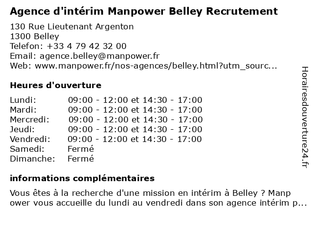 1 Agence d'Intérim Manpower Belley (Distance: 0,62 km) 5 Place de la Victoire, 01300 Belley agence, agence de recrutement, agence intérim, agence pour l'emploi, belley, cabinet de recrutement, cdi, d'intérim, intérim, manpower, recrutement 2 Recrutement Services (Distance: 1,04 km) 41 avenue Charles Vulliod, 01300 Belley agence, emploi, fixe, interim, recherche, recrutement, services, temporaire 3 Initial Intérim (Distance: 18,74 km) 301 grande Rue, 38510 Morestel agence, emploi, fixe, initial, interim, intérim, recherche, temporaire 4 Agence d'Intérim Manpower Aix les bains (Distance: 18,95 km) 20 Place Georges Clemenceau, 73100 Aix-les-Bains agence, agence de recrutement, agence intérim, agence pour l'emploi, aix, bains, cabinet de recrutement, cdi, d'intérim, intérim, les, manpower, recrutement 5 Illico Intérim (Distance: 18,96 km) 182 rue François Perrin, 38510 Morestel agence, agence d'intérim, emploi, illico, intérim 6 |