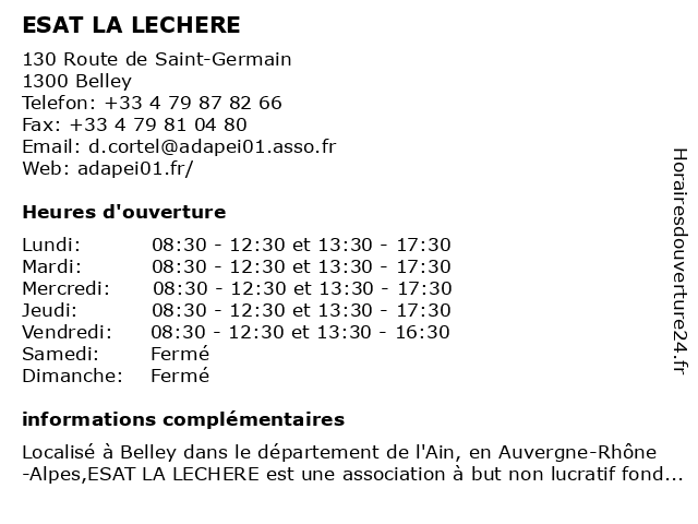 1 ESAT du Colombier - Odynéo (Distance: 2,41 km) 214 Route de Parves, 01300 Belley colombier, du, esat, odynéo 2 ESAT du Colombier - Odynéo (Distance: 2,74 km) 214 Route de Parves, 01300 Belley colombier, du, esat, odynéo 4 ESAT Myriade - Fondation OVE (Distance: 45,05 km) - Zone artisanale du Pont de Laffin, 74210 Giez accueil, aides, d'aide, esat, et, etablissement, fondation, le, myriade, médico social, ove, par, santé, service, sociale, soins, travail, établissement 5 OVE - ESAT Myriade (Distance: 46,86 km) 489 Route de Viuz, 74210 Faverges accueil, aides, d'aide, esat, et, etablissement, fondation, le, myriade, médico social, ove, par, santé, service, sociale, soins, travail, établissement 6 Esat Myriade - Fondation OVE (Distance: 51,51 km) 7 Rue du Mont Charvin, 74230 Thônes accueil, aides, d'aide, esat, et, etablissement, fondation, le, myriade, médico social, ove, par, santé, service, sociale, soins, travail, établissement |