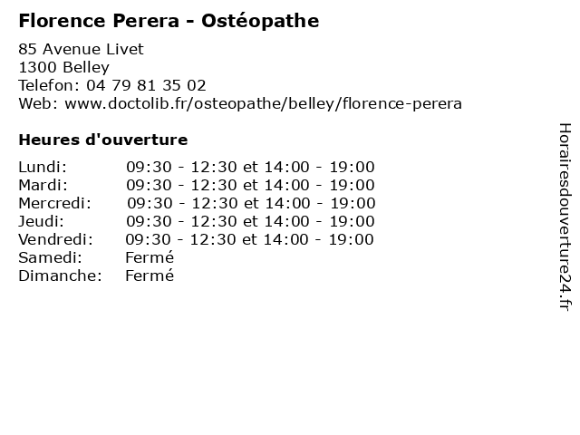 1 Florence Perera - Ostéopathe (Distance: 0,00 km) 85 Avenue Livet, 01300 Belley docteur, florence, médecin, médecine, ostéopathe, perera, secrétariat 2 Florence Perera - Ostéopathe (Distance: 0,02 km) 85 Avenue Livet, 01300 Belley florence, ostéo, ostéopathe, ostéopathes, perera, soins 3 Florence Dubost - Sage-femme (Distance: 0,74 km) 52 rue Georges Girerd, 01300 Belley consultation, docteur, dubost, femme, florence, med, medecine, medical, médecin, sage, traitement 4 Lopes Florence - Infirmier - Infirmière (Distance: 23,39 km) 360 Route de Belmont Tramonet, 73330 Domessin docteur, florence, infirmier, infirmière, lopes, medecins, sante 5 Lopes Florence - Infirmier - Infirmière (Distance: 24,43 km) 8 Place Carouge, 73330 Le Pont-de-Beauvoisin docteur, florence, infirmier, infirmière, lopes, medecins, sante 6 Medecin Florence Plantet (Anesthésiste) (Distance: 37,86 km) 4 Chemin de la Tour Reine, 74000 Annecy anesthésiste, docteur, florence, medecin, plantet, sante, services |