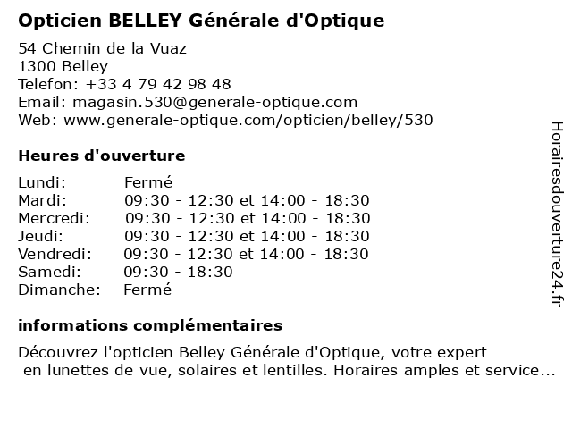 1 Générale D'Optique Belley (Distance: 0,01 km) 54 Chemin de la Vuaz, 01300 Belley belley, d'optique, générale 2 Atol Mon Opticien Belley (Distance: 0,33 km) Avenue Charles de Gaulle, 01300 Belley atol, atol les opticiens, atol mon opticien, belley, lentilles, lunettes de soleil, lunettes de vue, mon, opticien, opticien belley 3 Opticien Krys (Distance: 0,37 km) Zac De L'ousson, 01300 Belley krys, magasin de lentilles correctrices, magasin de lunettes de soleil, magasin d’accessoires de mode, opticien, optométrie 4 Opticien Belley - Optic 2000 (Distance: 1,60 km) 14 Rue de la République, 01300 Belley 2000, belley, lentilles de contact, lunettes de soleil, lunettes de vue, optic, optic2000, opticien, opticien optic2000, ray-ban, rayban 5 Opticien Krys (Distance: 17,24 km) 14 Rue Des Allobroges, 73100 Grésy-sur-aix krys, magasin de lentilles correctrices, magasin de lunettes de soleil, magasin d’accessoires de mode, opticien, optométrie 6 La Lunetterie Opticien (Distance: 17,44 km) 18 Square Alfred Boucher, 73100 Aix-les-Bains la, lunetterie, opticien |