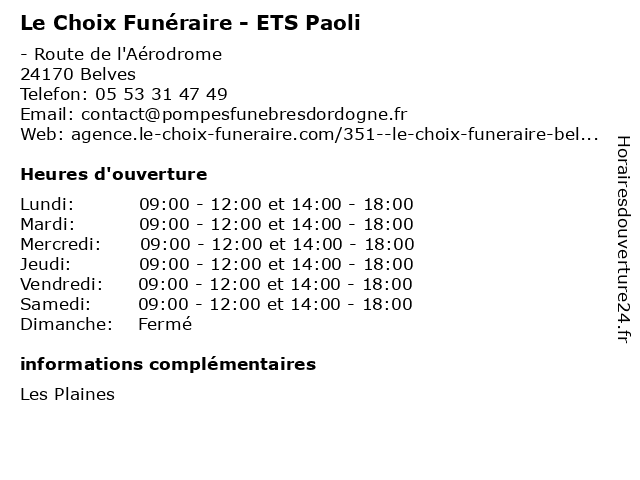 1 Le Choix Funéraire - ETS Paoli (Distance: 17,42 km) - Avenue Charles Maurial, 24550 Villefranche-du-Périgord choix, devis, ets, fleurs funeraires, funeraire, funèbres, funéraire, le, marbrerie, obseques, paoli, pompes, urnes 2 Le Choix Funéraire - ETS Paoli (Distance: 18,16 km) 5 rue Magal (Vinzac), 24440 Beaumont-du-Périgord choix, devis, ets, fleurs funeraires, funeraire, funèbres, funéraire, le, marbrerie, obseques, paoli, pompes, urnes 3 Pompes Funèbres Paoli - Le Choix Funéraire (Distance: 0,13 km) Rue de L Aérodrome, 24170 Pays-de-Belvès choix, funèbres, funéraire, le, paoli, pompes 4 Services Funéraires Paoli (Distance: 0,13 km) Rue des Plaines, 24170 Belvès funéraires, paoli, services 6 |
