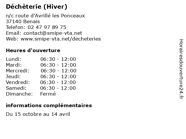 1 Déchèterie (Hiver) (Distance: 4,76 km) 1 impasse Clé des Champs, 37140 Bourgueil bennes, débarras, déchèterie, détritus, hiver, ordures 2 Déchèterie (Hiver) (Distance: 6,71 km) - Chemin pièce de la Dangelouge, 37130 Saint-Patrice bennes, débarras, déchèterie, détritus, hiver, ordures 3 Déchèterie (hiver) (Distance: 15,32 km) - la Maladrie, 49390 Vernantes déchèterie, gravats, hiver, huiles usées, la réception des déchets et écocentres, les appareils électroménagers, les déchets verts, papier et carton en quantité 4 Déchèterie (Hiver) (Distance: 19,25 km) 839 Route de la Prairie, 37340 Savigné-sur-Lathan bennes, débarras, déchèterie, détritus, hiver, ordures 5 Déchèterie (Été) (Distance: 6,71 km) - Chemin pièce de la Dangelouge, 37130 Saint-Patrice bennes, débarras, déchèterie, détritus, ordures, été 6 Déchèterie (Distance: 11,58 km) - ZI de la Gare, 37190 Rivarennes bennes, débarras, déchèterie, détritus, ordures |