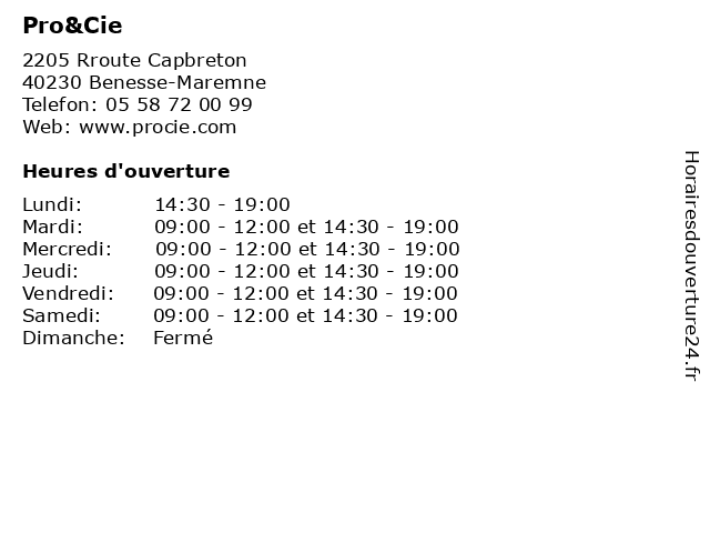 1 Pro&Cie (Distance: 1,82 km) 2205 route Capbreton, 40230 Benesse-Maremne electro, multimedia, pro&cie, telephonie 4 Nespresso (Pro & Cie) (Distance: 13,67 km) 2 Avenue du Maréchal Leclerc, 40140 Soustons accessories, cie, coffee, machines, nespresso, points de recyclage, pro, services 5 Lorenzo pizza et cie (Distance: 17,16 km) 2 Boulevard Jean D'amou, 64100 Bayonne cie, et, lorenzo, pizza 6 Pro BTP "accueil avec RDV" (Distance: 17,66 km) 3 boulevard du BAB, 64100 Bayonne "accueil, agence, assurance, avec, btp, pro, protection sociale du btp, rdv", retraite |
