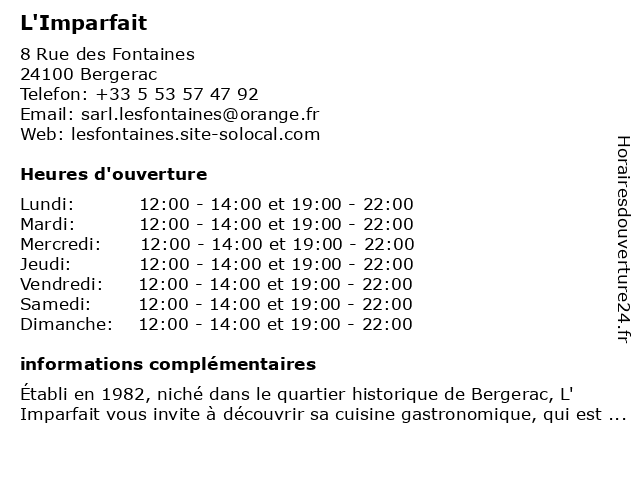 1 Restaurant L'Imparfait (Distance: 0,01 km) 8 rue des Fontaines, 24100 Bergerac bistrot, brasserie, café, l'imparfait, restaurant, restauration |