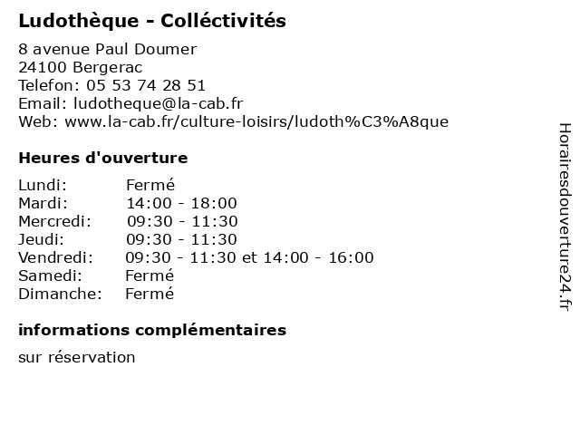 1 Ludothèque - Particuliers (Distance: 0,00 km) 8 avenue Paul Doumer, 24100 Bergerac animations, conseils, et, informations, jeux, jouets, les, ludothèque, particuliers, pendant, période, scolaire, vacances 2 Ludothèque Espace Bellegarde (Distance: 0,95 km) - Place Bellegarde, 24100 Bergerac associative, bellegarde, enfants, espace, jeu, ludothèque, municipale 3 L'Espace Jeunes - période scolaire (Distance: 0,68 km) 6 Place Doublet, 24100 Bergerac echanges, expressions, information jeunesse, informatons, jeunes, l'espace, période, rencontres, scolaire 4 Piscine Picquecailloux à Bergerac (Période scolaire) (Distance: 1,67 km) - Allée Lucien Videau, 24100 Bergerac bergerac, natation sportive, picquecailloux, piscine, période, scolaire, sportif 5 Piscine de Saint-Astier (Période scolaire) (Distance: 33,47 km) - La Gimel, 24110 Saint-Astier astier, de, natation sportive, piscine, période, saint, scolaire, sportif 6 Médiathèque Claude Michelet (Période Scolaire) (Distance: 37,58 km) . Le Bourg, 24430 Coursac catalogue en ligne, claude, collections adaptées au handicap, michelet, médiathèque, période, scolaire |
