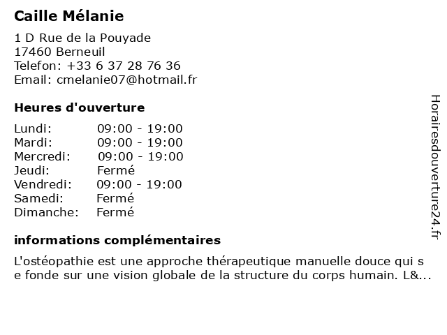 1 Mélanie Mahfoudi - Psychologue (Distance: 4,06 km) 44 Avenue de Saintonge, 17460 Tesson mahfoudi, mélanie, psy, psychiatre, psychologue, sante, soins 2 Mélanie Mahfoudi - Psychologue (Distance: 10,21 km) 41 Rue du Maréchal Foch, 17260 Gémozac folie, mahfoudi, mélanie, psychiatre, psychiatrie, psychiatrique, psychologue 3 Dr Mélanie Auber - Pédiatre (Distance: 11,94 km) 11 Boulevard Ambroise Paré, 17100 Saintes auber, consultation, docteur, dr, med, melanie, médecin, mélanie, pédiatre, traitement 4 Dr Mélanie Legeay - Médecin généraliste (Distance: 12,20 km) 7 Rue du Dr René Laennec, 17100 Saintes docteur, dr, generaliste, généraliste, legeay, medical, melanie, médecin, mélanie, soin 5 Mélanie Lefevre - Sage-femme (Distance: 32,79 km) 222 Avenue de Rochefort, 17200 Royan consultation, docteur, femme, lefevre, med, melanie, médecin, mélanie, sage, traitement 6 Les Bocaux De Mélanie (Distance: 42,34 km) 36 Rue Toufaire, 17300 Rochefort alimentation, bio, bocaux, de, fruits, les, légumes, mélanie, vrac, épicerie |