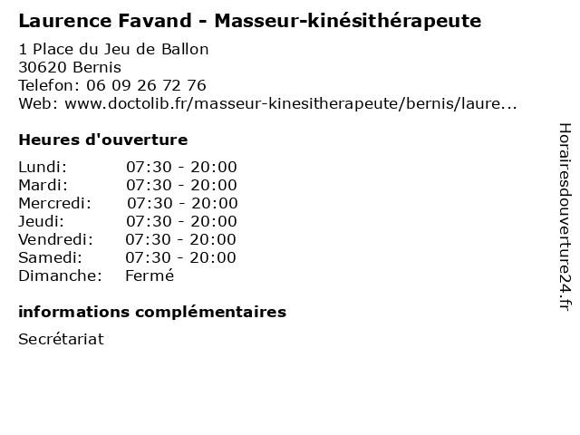 1 Laurence Favand - Masseur-kinésithérapeute (Distance: 7,99 km) 20 Place Pierre de Fermat, 30900 Nîmes docteur, favand, kine, kinesitherapeute, kinésithérapeute, laurence, masseur 3 Dr Laurence Romano - Médecin généraliste (Distance: 7,14 km) 4 Rue du Professeur Robert Debré, 30900 Nîmes consultation, docteur, dr, généraliste, laurence, med, médecin, romano, traitement 4 Laurence Bodart - Ostéopathe (Distance: 8,54 km) - Place des Goélands, 30900 Nîmes bodart, laurence, ostéo, ostéopathe, ostéopathes, soins 5 Favand (Distance: 8,67 km) 306 Rue des Pélicans, 30900 Nîmes acupuncture, cabinet favand, favand, massage tui na, pharmacopée., énergétique chinoise 6 |