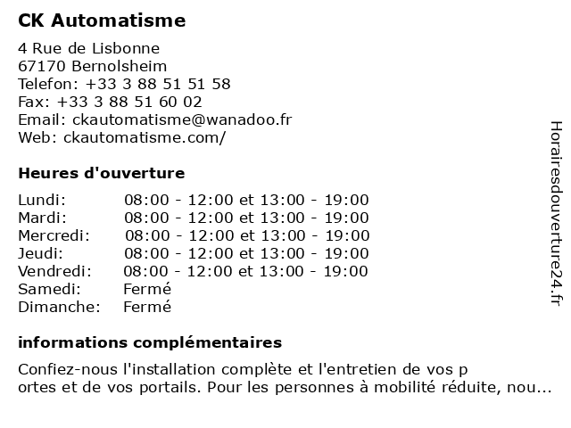 | Lundi | 08:00-12:00 et 13:00-19:00 |