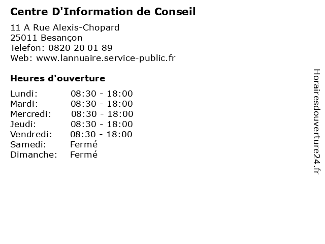 1 Centre D'Information de Conseil (Accueil téléphonique ) (Distance: 0,00 km) 11 A Rue Alexis-Chopard, 25011 Besançon accueil, administration, assoc, centre, conseil, d'information, de, services, services publics, téléphonique 2 Conseil de Prud'Hommes (Distance: 0,58 km) 1 Rue Delavelle, 25000 Besançon administration, assoc, conseil, de, prud'hommes, services, services publics 3 Action Information Recherche - AIR (Distance: 0,62 km) 6 boulevard Diderot, 25000 Besançon action, air, association, conseils, expertise, information, parents, partenariat, personne handicapée, recherche 4 Centre d'information et de recrutement des forces armées (CIRFA) (Distance: 1,01 km) 64 Rue Bersot, 25000 Besançon armées, centre, cirfa, d'information, de, des, et, forces, gendarmerie, inscriptions, nationale, recrutement, renseignements 5 Agence départementale d'information sur le logement (ADIL) (Distance: 1,10 km) 1 Chemin de Ronde-du-Fort-Griffon, 25000 Besançon adil, administration, agence, assoc, d'information, départementale, le, logement, services, services publics, sur 6 Centre d'Information sur les Droits des Femmes et des Familles (CIDFF) (Distance: 1,45 km) 14 Rue Violet, 25000 Besançon administration, assoc, centre, cidff, d'information, des, droits, et, familles, femmes, les, services, services publics, sur |