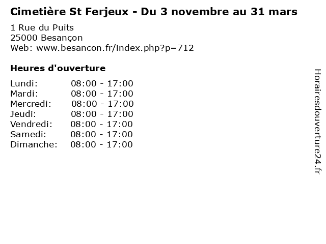 1 Cimetière St Ferjeux - Du 1er avril au 30 septembre (Distance: 0,00 km) 1 Rue du Puits, 25000 Besançon 1er, 30, arbre, au, avril, cimetiere, cimetière, du, espace vert, ferjeux, forêt, funeraire, jardin, loisirs, nature, parc, prairie, septembre, square, st 2 Cimetière St Ferjeux - Du 1er octobre au 2 novembre (Distance: 0,00 km) 1 Rue du Puits, 25000 Besançon 1er, arbre, au, cimetiere, cimetière, du, espace vert, ferjeux, forêt, funeraire, jardin, loisirs, nature, novembre, octobre, parc, prairie, square, st 3 Cimetière des Chaprais - Du 3 novembre au 31 mars (Distance: 2,06 km) 1 Place D., 25000 Besançon 31, arbre, au, chaprais, cimetiere, cimetière, des, du, espace vert, forêt, funeraire, jardin, loisirs, mars, nature, novembre, parc, prairie, square 4 Cimetière de Velotte - Du 3 novembre au 31 mars (Distance: 2,32 km) 50 Chemin de Vosselle, 25000 Besançon 31, arbre, au, cimetiere, cimetière, de, du, espace vert, forêt, funeraire, jardin, loisirs, mars, nature, novembre, parc, prairie, square, velotte 5 Le Coussin sur son 31 (Distance: 2,77 km) s/n Rue des Granges, 25000 Besançon 31, coussin, créateur de coussins, guirlandes, le, plaids, pochettes et sacs., son, sur 6 Musée Citadelle de Besançon Basse saison 31 octobre au samedi 31 decembre (Distance: 3,55 km) 99 Rue des Fusillés, 25000 Besançon 31, ancien, art, au, basse, besançon, chateau, citadelle, de, decembre, et, exposition, histoire, livre, monument, musee, musée, octobre, saison, samedi |