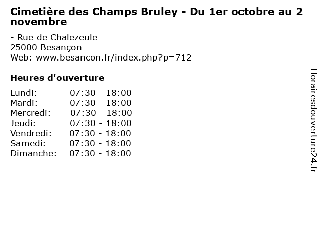 1 Cimetière des Champs Bruley - Du 1er avril au 30 septembre (Distance: 0,00 km) - Rue de Chalezeule, 25000 Besançon 1er, 30, arbre, au, avril, bruley, champs, cimetiere, cimetière, des, du, espace vert, forêt, funeraire, jardin, loisirs, nature, parc, prairie, septembre 2 Cimetière de Saint-Claude - Du 1er octobre au 2 novembre (Distance: 2,15 km) 3 Place du Souvenir Français, 25000 Besançon 1er, arbre, au, cimetiere, cimetière, claude, de, du, espace vert, forêt, funeraire, jardin, loisirs, nature, novembre, octobre, parc, prairie, saint, square 3 Musée Citadelle de Besançon Basse saison 31 octobre au samedi 31 decembre (Distance: 2,16 km) 99 Rue des Fusillés, 25000 Besançon 31, ancien, art, au, basse, besançon, chateau, citadelle, de, decembre, et, exposition, histoire, livre, monument, musee, musée, octobre, saison, samedi 4 Déchèterie - Mars à Octobre (Distance: 3,22 km) - rue des Bruyères, 25220 Thise bennes, débarras, déchèterie, détritus, mars, octobre, ordures, poubelles 5 Cimetière de Velotte - Du 1er octobre au 2 novembre (Distance: 3,75 km) 50 Chemin de Vosselle, 25000 Besançon 1er, arbre, au, cimetiere, cimetière, de, du, espace vert, forêt, funeraire, jardin, loisirs, nature, novembre, octobre, parc, prairie, square, velotte 6 Cimetière de Velotte - Du 1er avril au 30 septembre (Distance: 3,75 km) 50 Chemin de Vosselle, 25000 Besançon 1er, 30, arbre, au, avril, cimetiere, cimetière, de, du, espace vert, forêt, funeraire, jardin, loisirs, nature, parc, prairie, septembre, square, velotte |